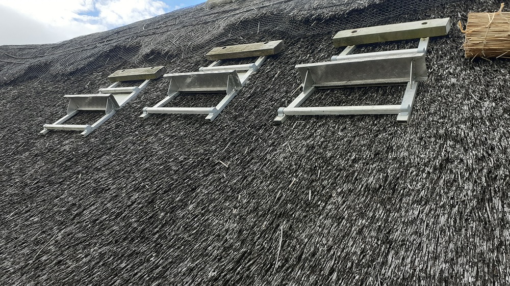 They are called Biddles. They are for standing on while working. They have long hooks on them that poke into the roof and are held by the sway that holds the courses of reed/straw down. They are very handy to get to awkward places, where it is difficult to get a ladder to. If you have plenty of them it speeds work up a lot. You can view a few versions of them on this website: